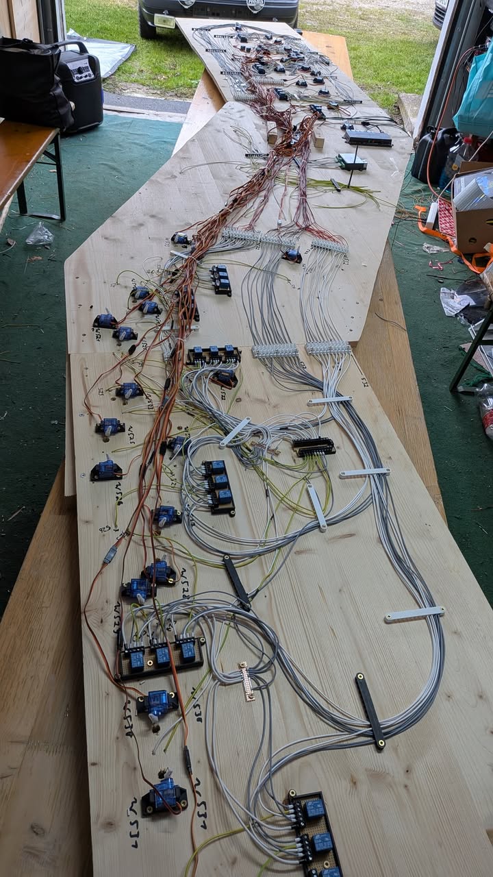 ein großer Schritt nach vorne bei unserer neuen N-Anlage! Die Verkabelungsarbeiten sind nahezu fertiggestellt - zu sehen sind die vielen Servos für die Weichenantriebe sowie die Belegtmelder-Abschnitte, die künftig den vollständig PC-gestützten Betrieb ermöglichen.