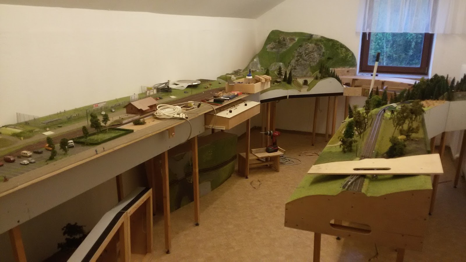 Für die H0-Anlage wurden vier Löcher durch die Mauern gebohrt. Ein paar Module stehen schon, unter anderem ein Modul auf dem Gang (letztes Foto), ein Bogenmodul entsteht gerade. Aber es ist noch viel zu tun.